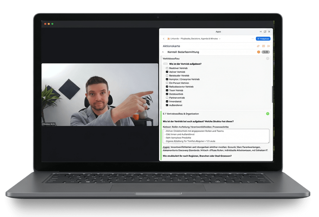 Du hast Methoden, Gesprächsstrukturen und Erfahrung aus unzähligen Trainings. Wir machen daraus digitale Playbooks, die täglich im echten Verkaufsgespräch genutzt werden.